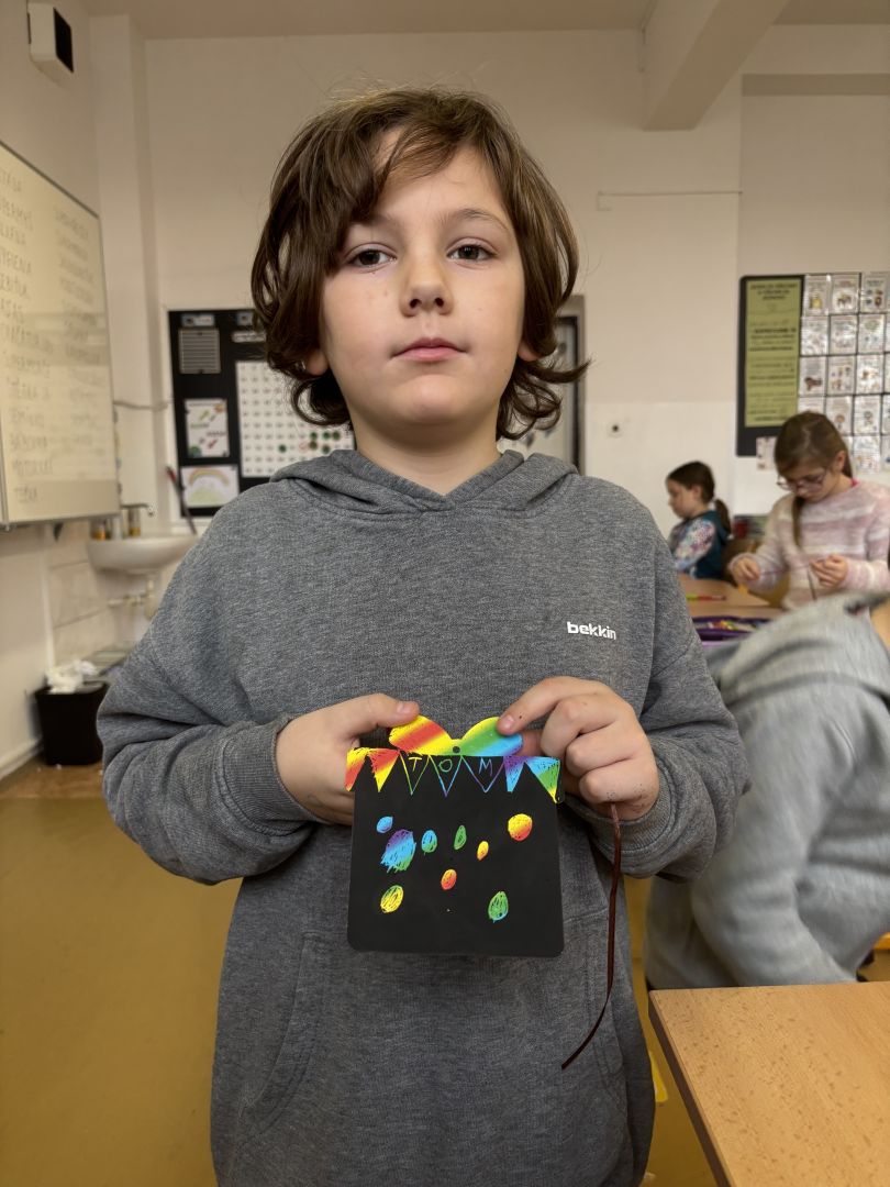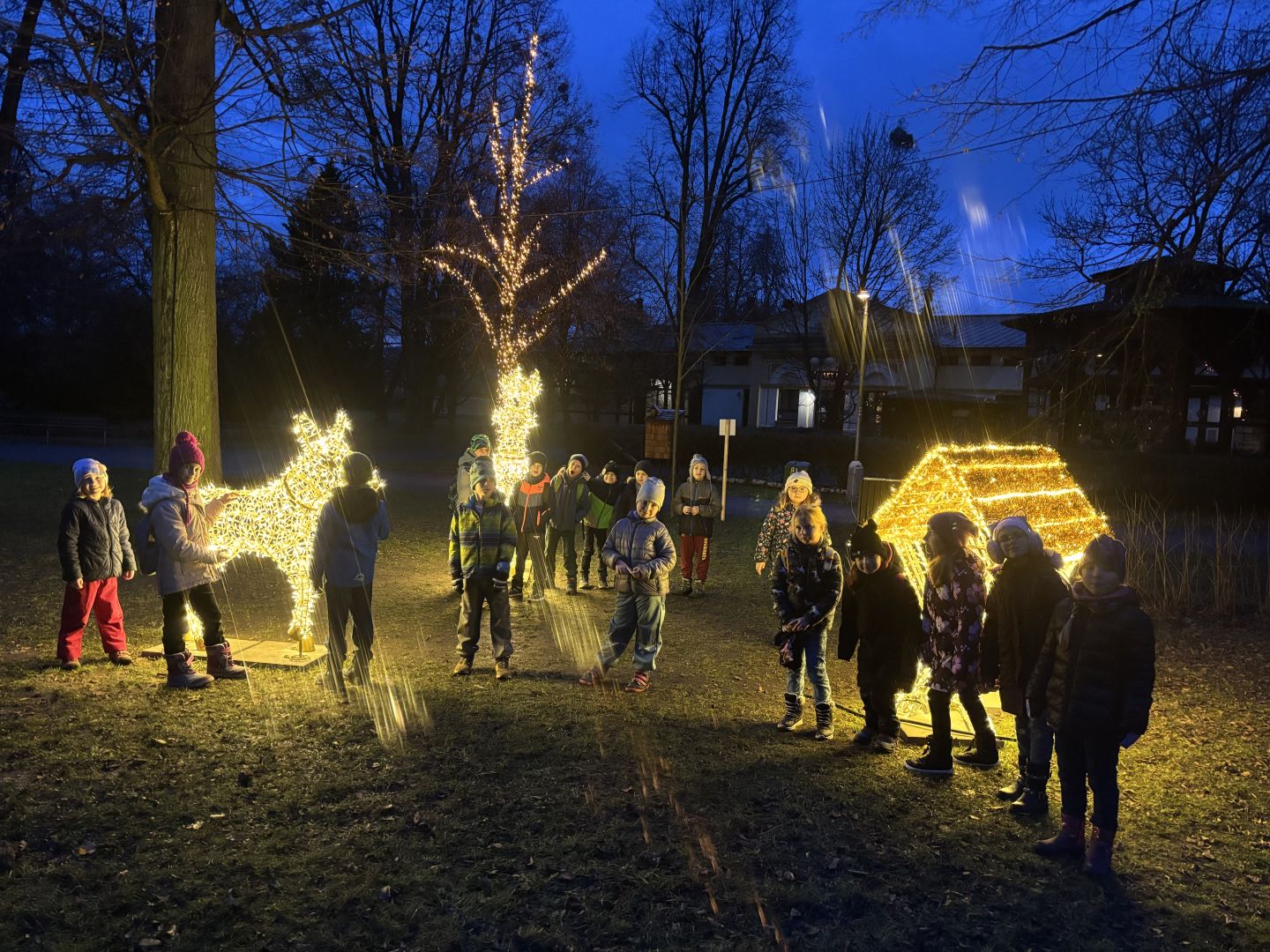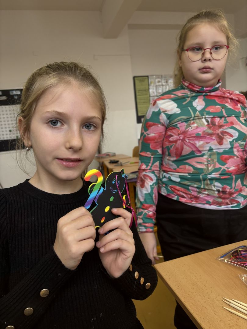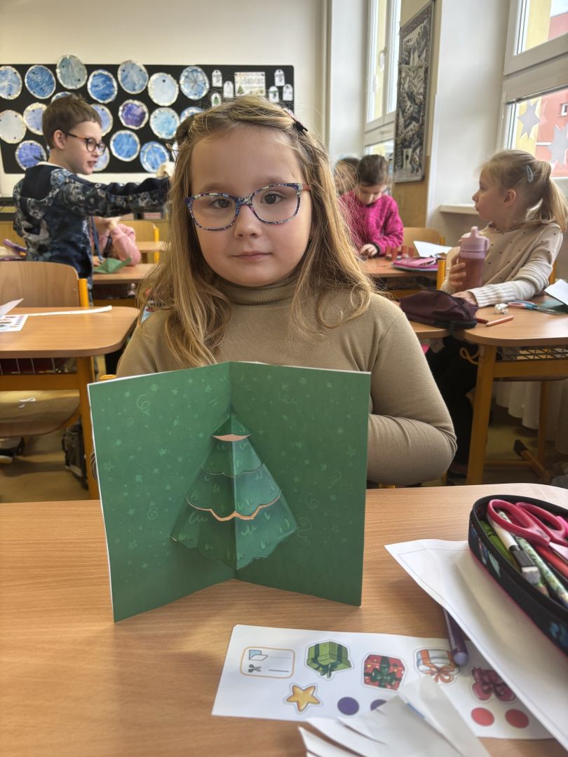 V posledním předvánočním týdnu do školy přijelo mobilní planetárium, ve kterém jsme viděli tři kratší výukové programy. Ve středu jsme měli „volný vánoční den“ – hráli jsme vánoční kufr, zimní únikovku, vyráběli jsme přáníčka a vyškrabávané obrázky a měli hodinu angličtiny o Vánocích. Odpoledne jsme měli sraz ve třídě a čekala nás už tradiční vánoční přespávačka ve škole. Děti jsou již po loňském kurzu přežití v přírodě, takže vybalení karimatek a spacáků byla pro ně brnkačka. Zahráli jsme si pár her, zatančili na improvizované diskotéce, mrkli na vánoční pohádku, zahráli si vánoční šipkovanou a šlo se pomalu spát (no, jak kdo). Ráno po probuzení jsme se nasnídali ze zásob od rodičů, poklidili třídu a tradá do solné jeskyně. Po cestě zpět do školy jsme se na náměstí povozili na kolotoči. V pátek nás už čekala jen besídka, vánoční hra „Riskuj“ a přehlídka talentů naší třídy v „Talentmánii“. A pak už HURÁ – vánoční prázdniny.