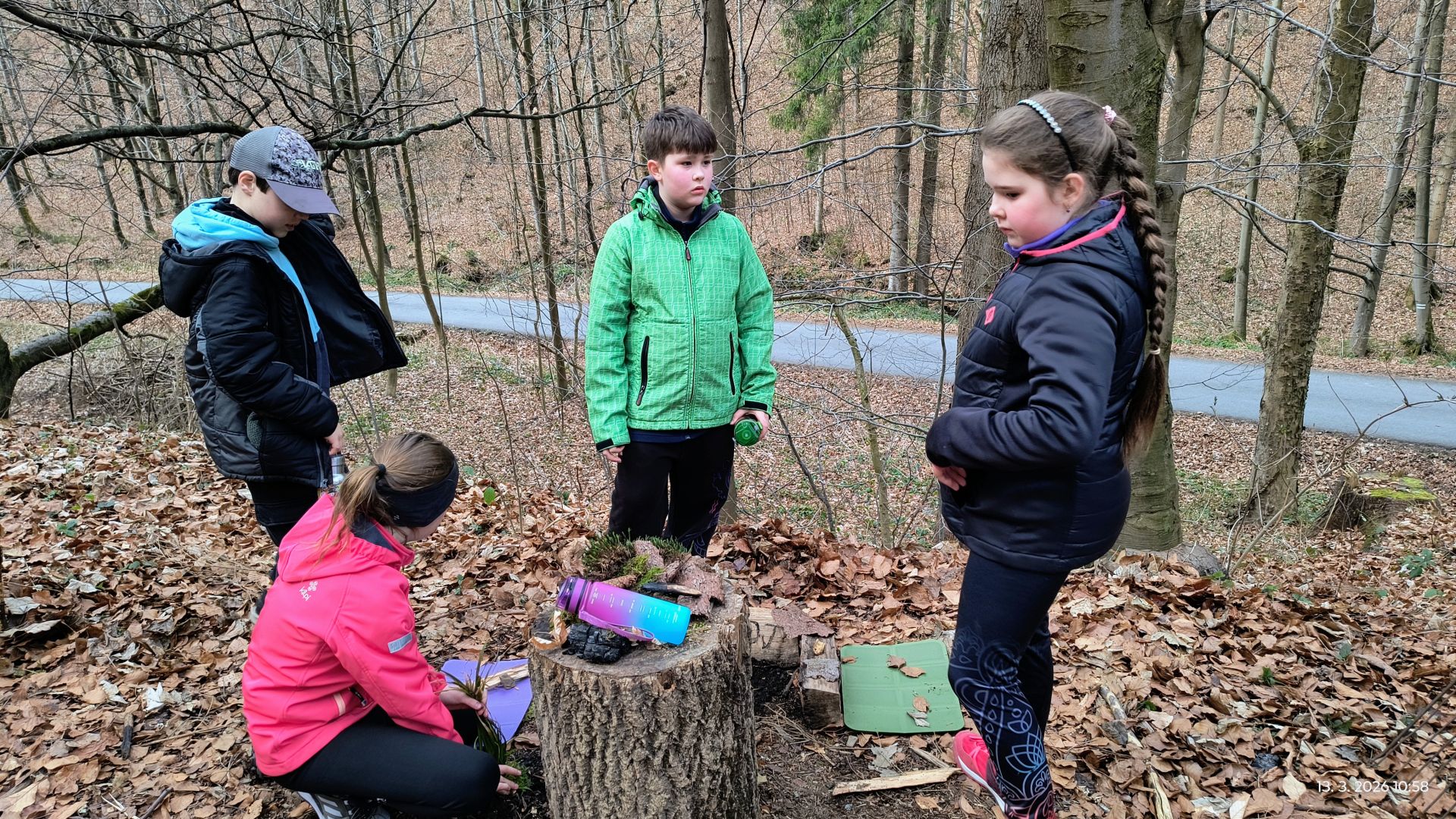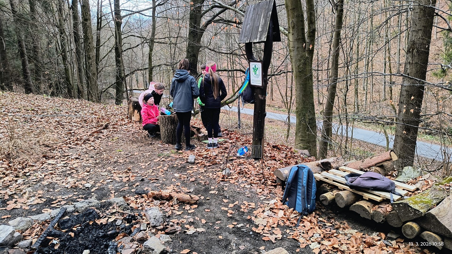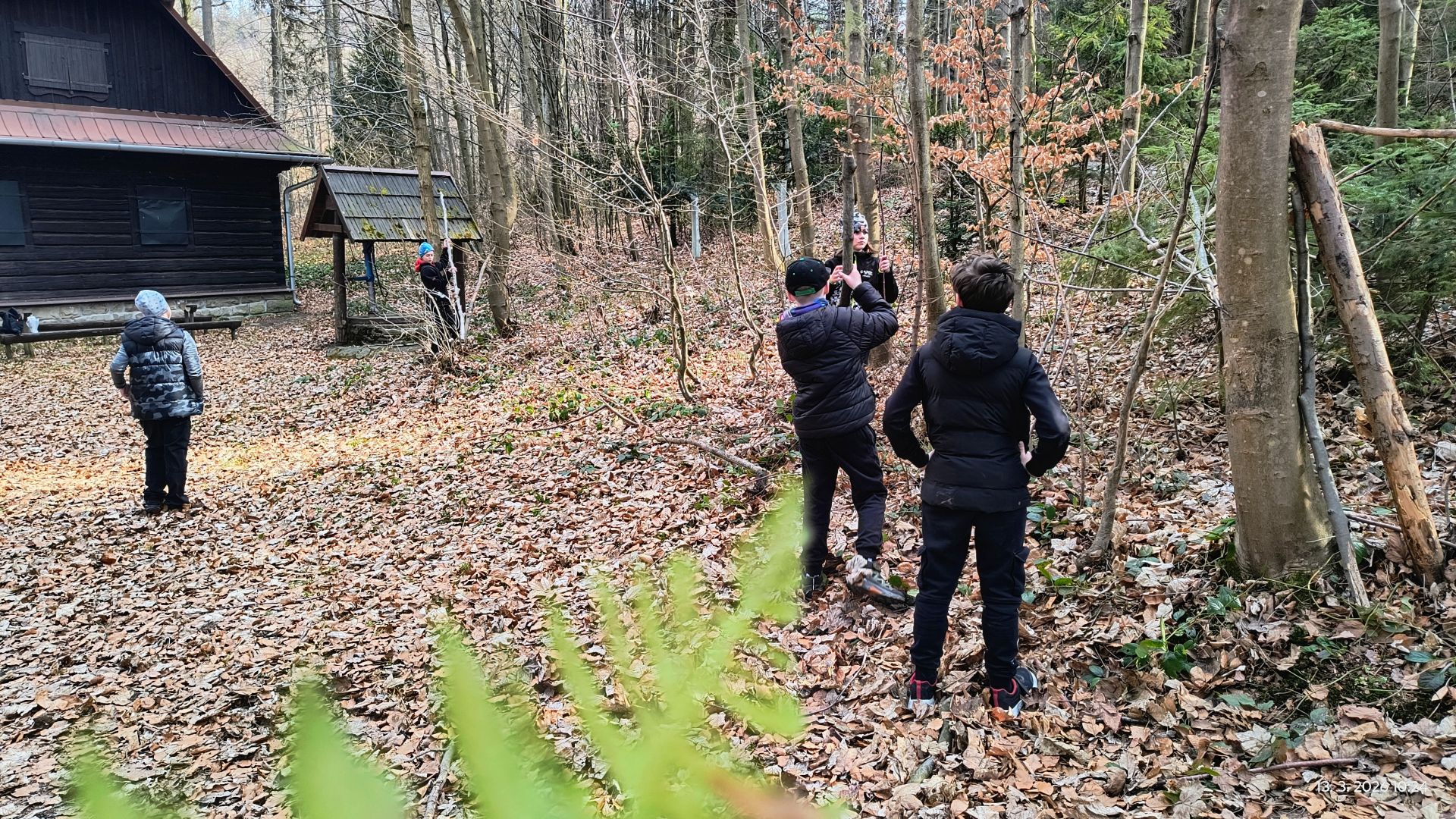 Ale cíl našeho putování je schovaný v lese ještě kousek dál. Cestou, kterou mnozí už několikrát prošli, si dřevěné chaloupky na mírném kopečku nikdy nevšimli. Ukrytá mezi stromy, tak trochu by v ní jeden čekal pověstnou ježibabku s roztopenou pecí. My jsme tam dojedli svačiny, postavili domečky a bunkry, poznali jehličnany v okolí, zjistili, jak je to s kapradinami. našli jsme fialky, sasnky i prvosenku,.
