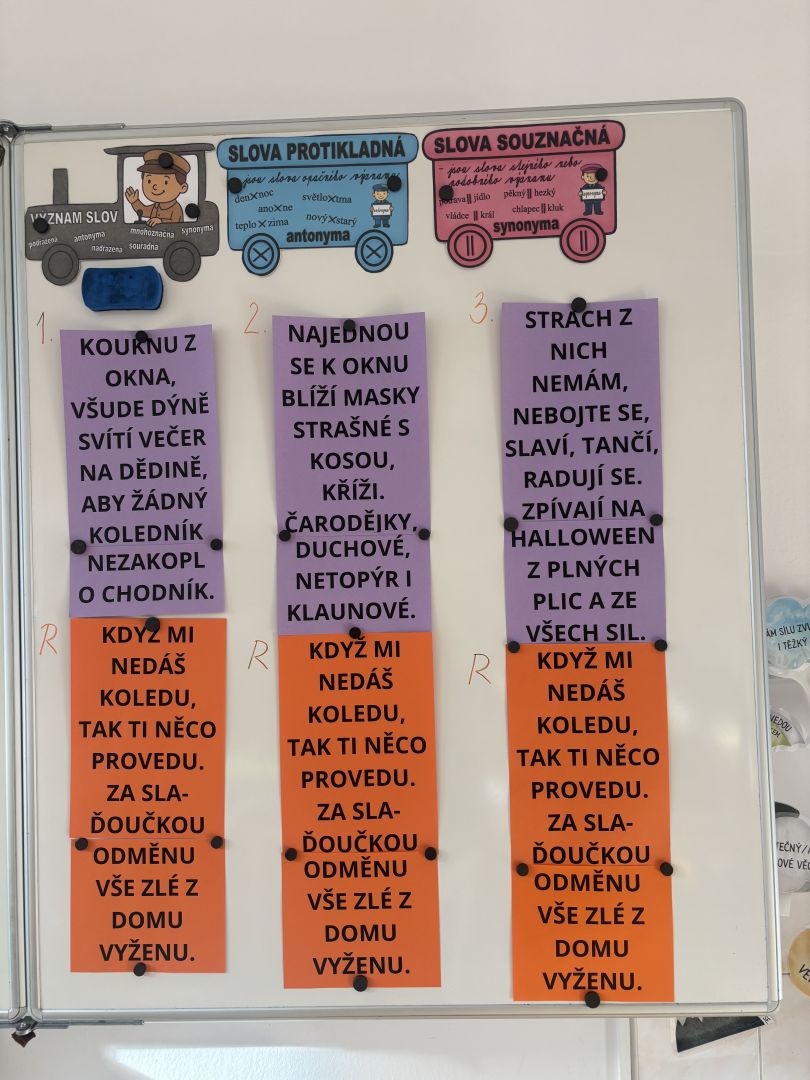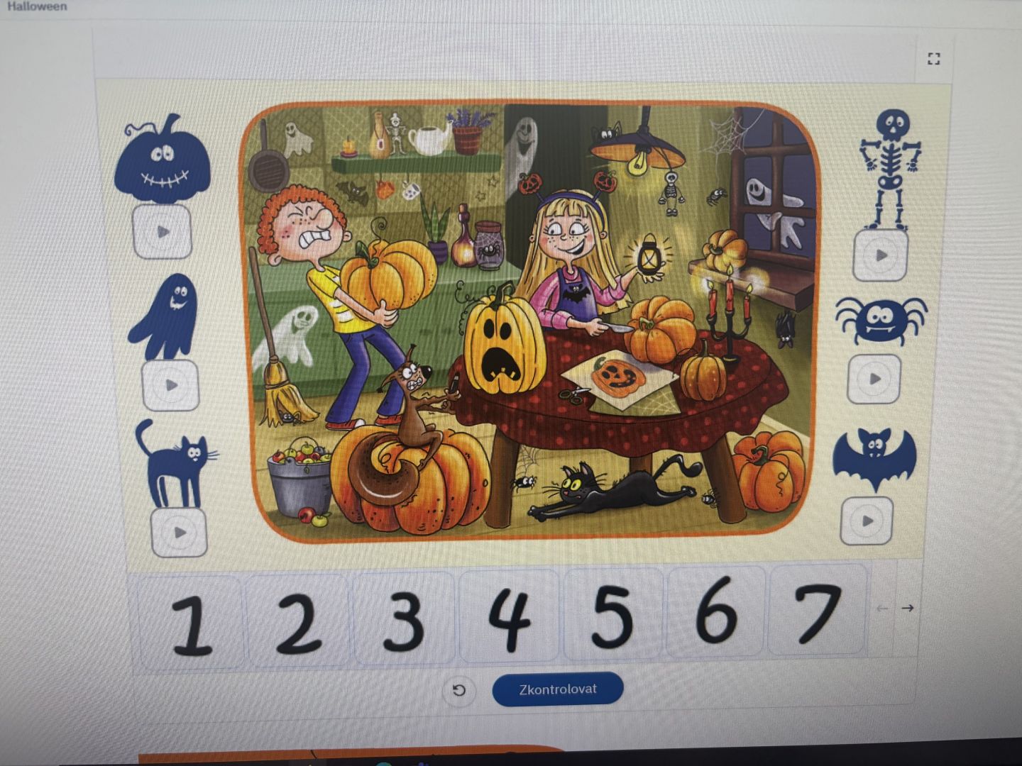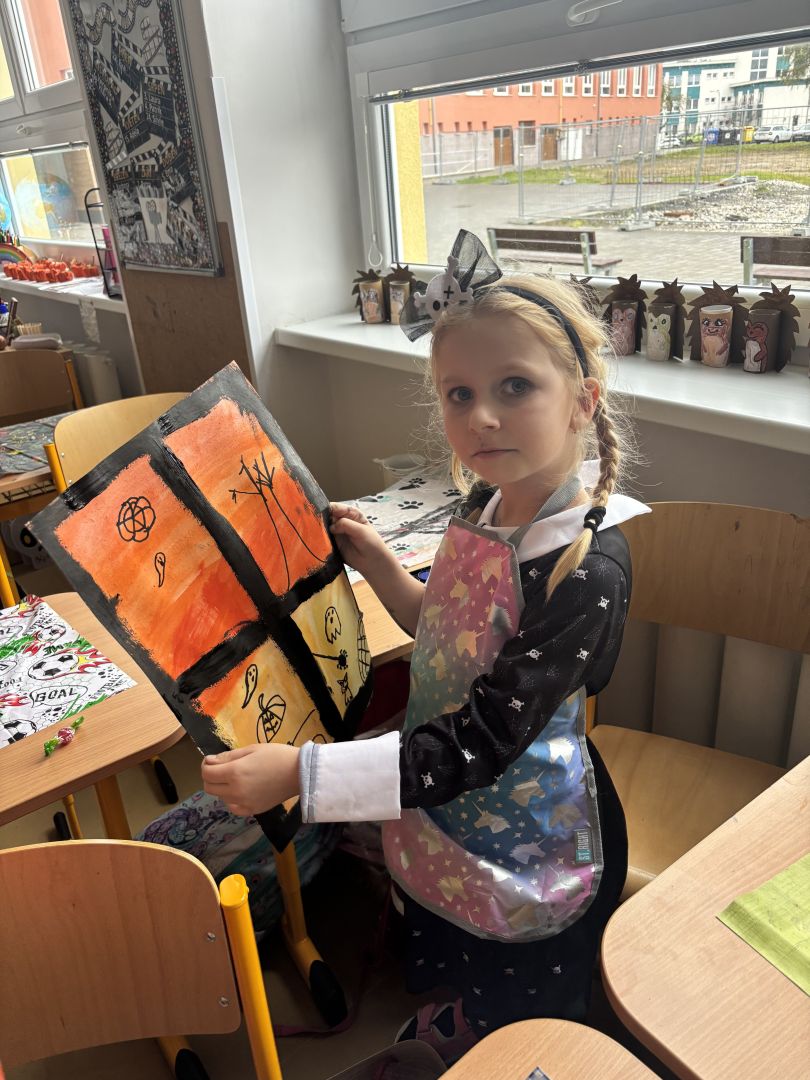 Po návratu zpět do tříd byla "extra English lesson - Halloween". Rozšířili jsme si anglickou slovní zásobu, pracovali jsme i s podzimními samolepkami. Dále jsme vytvářeli lapbooky zaměřené na porovnání českého svátku Dušičky a anglického Halloweenu. A v neposlední řadě jsme stihli namalovat parádní okno, za nímž se to jen hemžilo duchy, příšerami, pavouky, dýněmi a všemožnými strašidly.