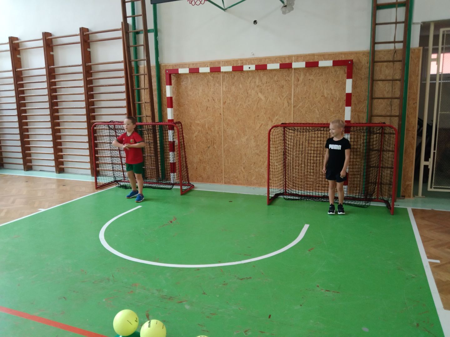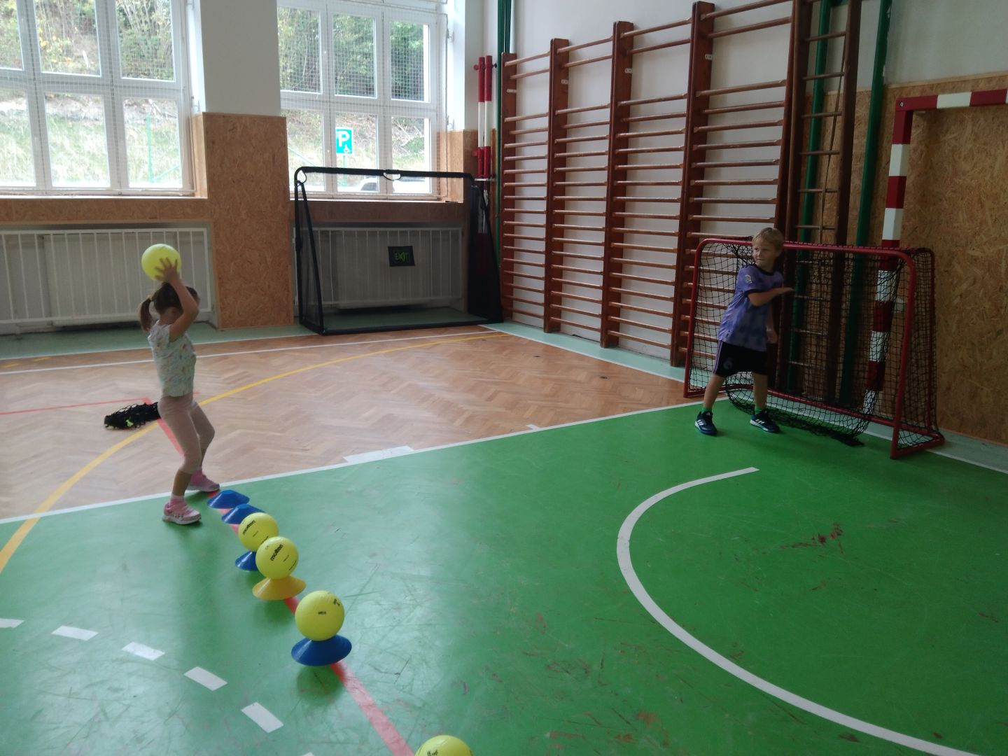 Po této zábavné hře se děti rozdělily do dvou družstev, ve kterých si formou hry vyzkoušely různé způsoby hodu míčem na branku, přičemž překonávaly připravené překážky. Trénink probíhal hravou formou a děti si ho velmi užily.
