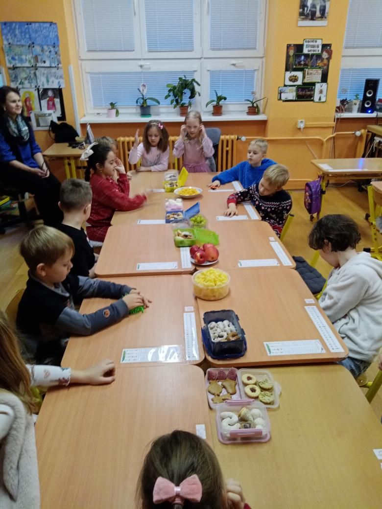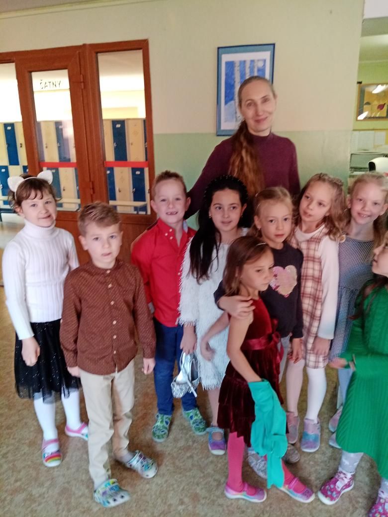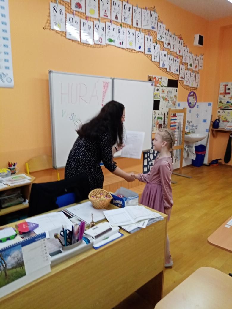 Cože, to už chodíme do školy půl roku? Budeme dostávat vysvědčení? A co to je? Na tyhle otázky musela tento týden odpovídat paní učitelka Pavla. V posledním týdnu školy jsme zhodnotili, co všechno jsme se už naučili, v čem bychom se měli zlepšit a naopak, co nám jde a za co nás paní učitelka může chválit. V kouzelné třídě toho stíháme opravdu mnoho – nejen učení, ale i spoustu mimoškolních akcí. Na co rádi vzpomínáme? Třeba na fairtradeovou dílnu a pečení perníčků, nebo jak jsme si „den laskavec“ prodloužili na měsíc laskavec, protože každý den se našel ve třídě někdo, kdo se choval laskavě k nám ostatním: třeba pomohl spolužákovi, pochválil paní učitelku, poděkoval paní recepční za vše, co pro nás ve škole dělá, nebo přinesl paní učitelce, či kamarádovi nějaký maličký dárek. V den laskavosti jsme také byli poděkovat našim deváťákům za to, že jsou naši velcí kamarádi a chodí si s námi o přestávkách hrát.