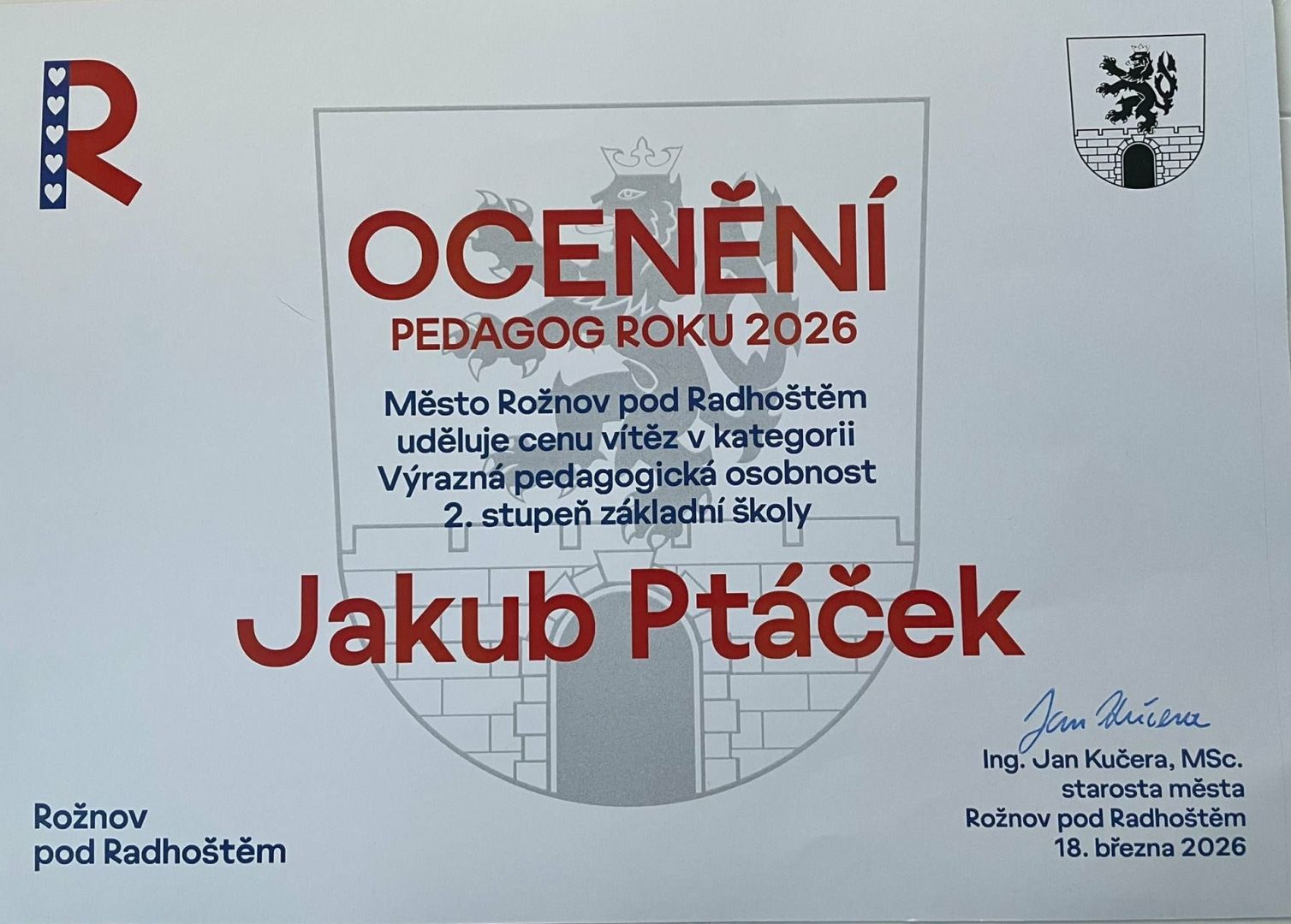 Mezi nominovanými výrazně zazářil Mgr. Jakub Ptáček, který se stal držitelem ocenění Pedagog roku 2026 a výrazná pedagogická osobnost v kategorii 2. stupeň základní školy. Jeho profesní přístup, moderní metody ve výuce a inspirace, kterou přináší svým žákům, jsou příkladem kvalitní pedagogické práce.