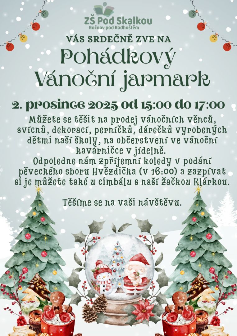 ZŠ Pod Skalkou Vás srdečně zve na Pohádkový vánoční jarmark, který se uskuteční dne 2.12.2025 od 15 - 17 hodin.