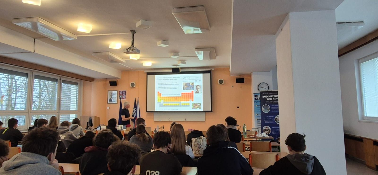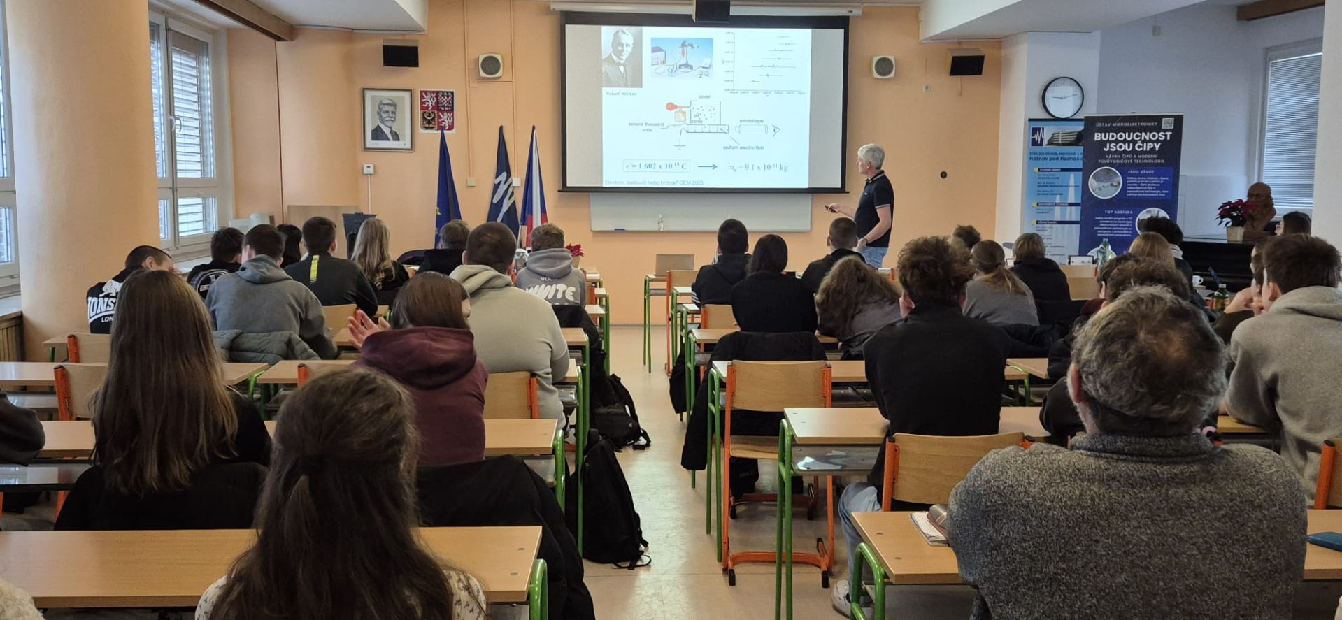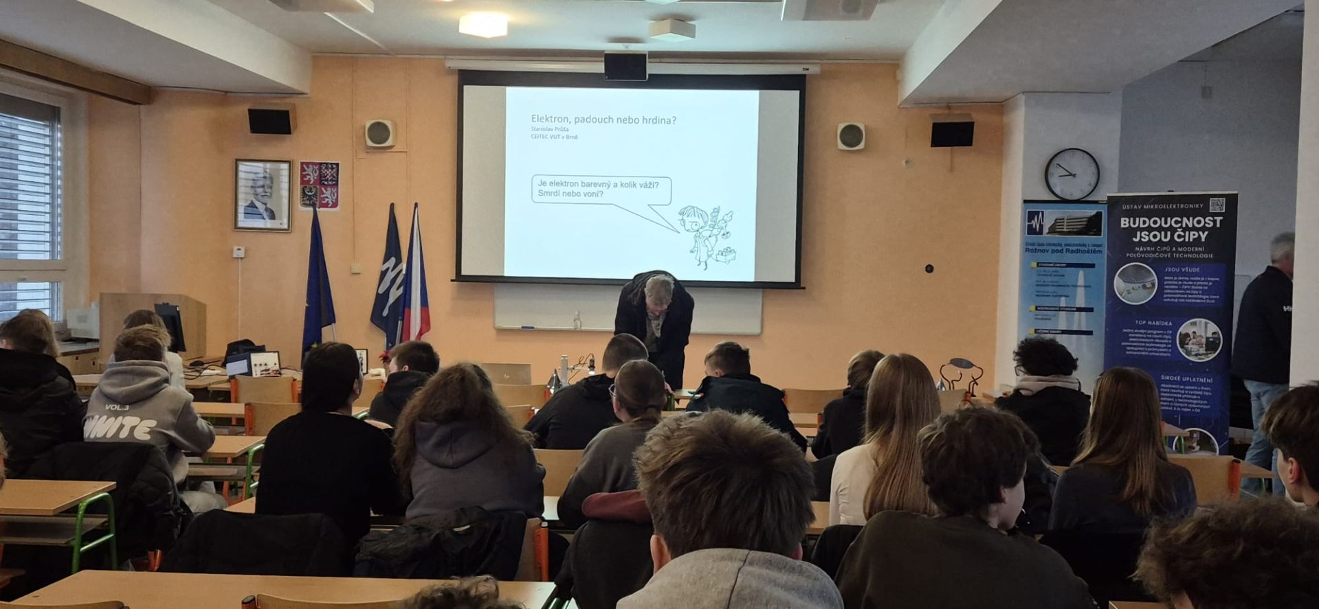 Tentokrát jsme s našimi deváťáky zavítali na nedalekou “Vakuovku”, kde nás přilákala přednáška na téma “Příběh elektronu” od doc. Ing. Stanislava Průši z fakulty strojního inženýrství z VUT Brno.