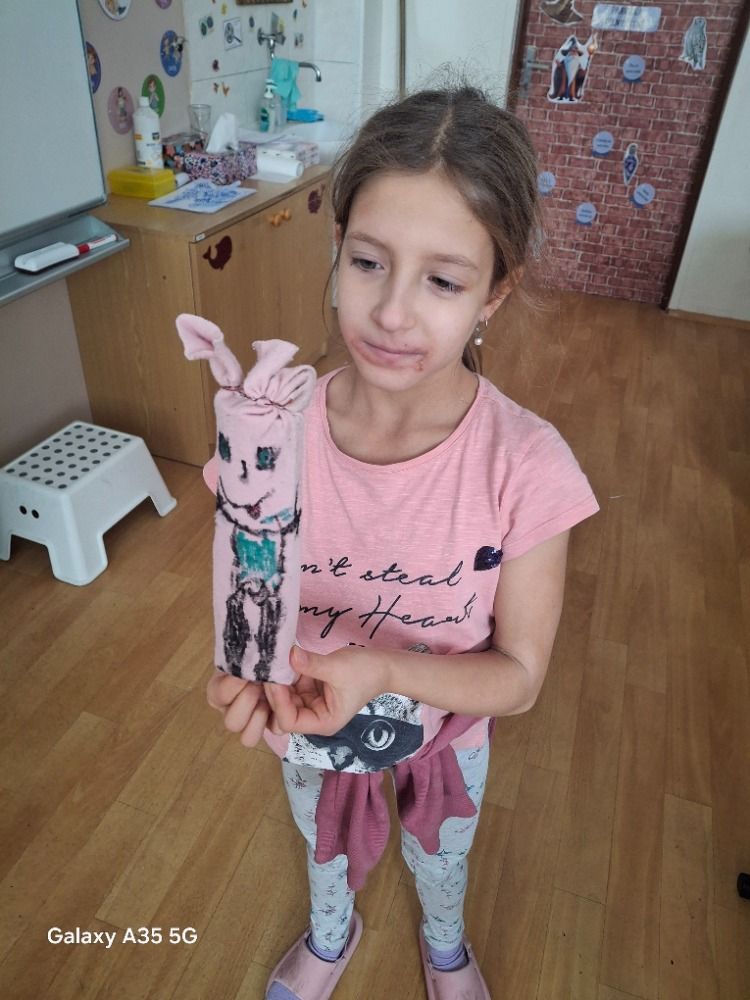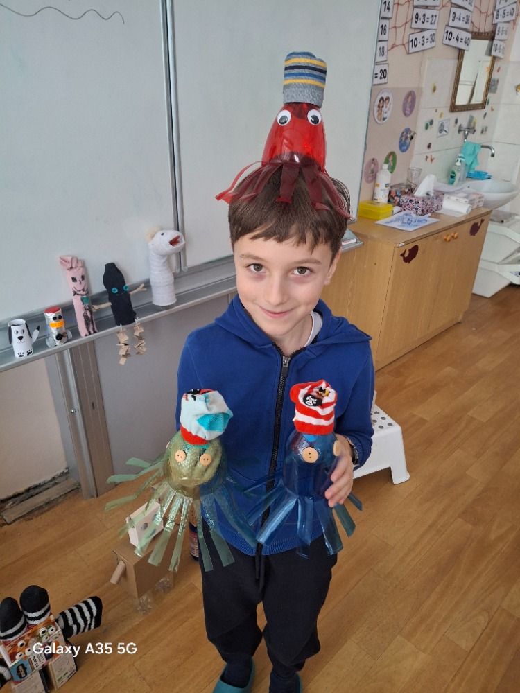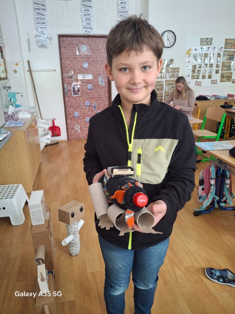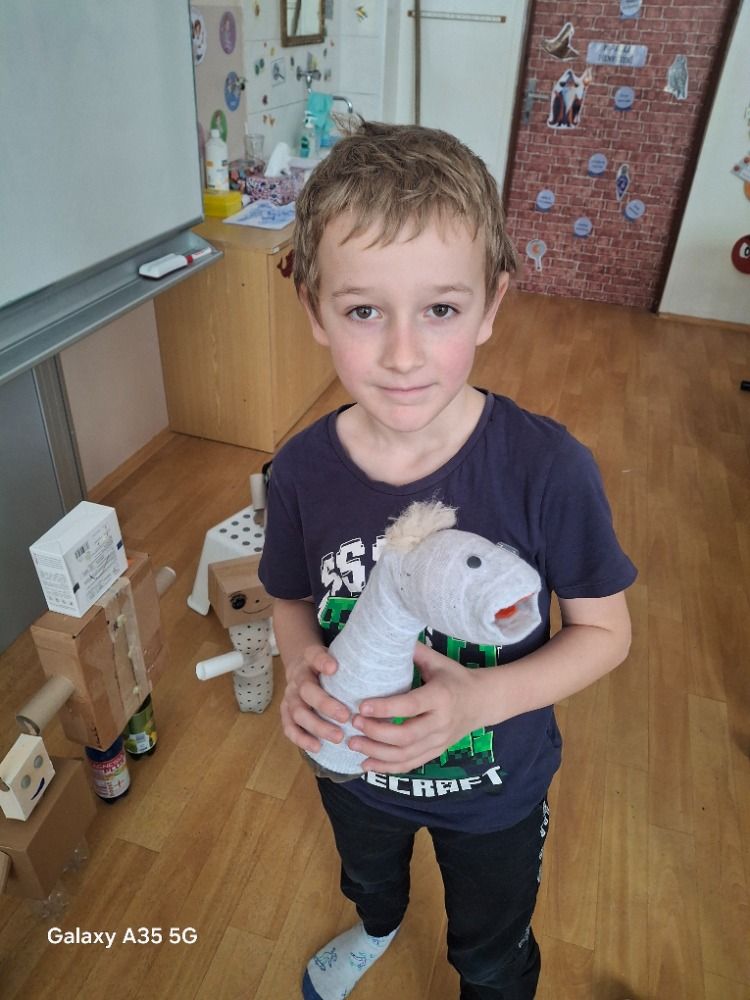 Žáci dostali za úkol kreativně použít zbytkový materiál (plastová láhev, ponožka, toaletní rolička, krabička, knoflíky) a navrhnout vlastní hračku. V rámci tvoření se učili používat v angličtině množné číslo a rozšiřovat slovní zásobu o nová slova. Všechny výrobky byly naprosto úžasné. Sešla se nám plejáda chobotnic, robotů, panenek, krtků a dopravních prostředků. „Good job, boys and girls!“