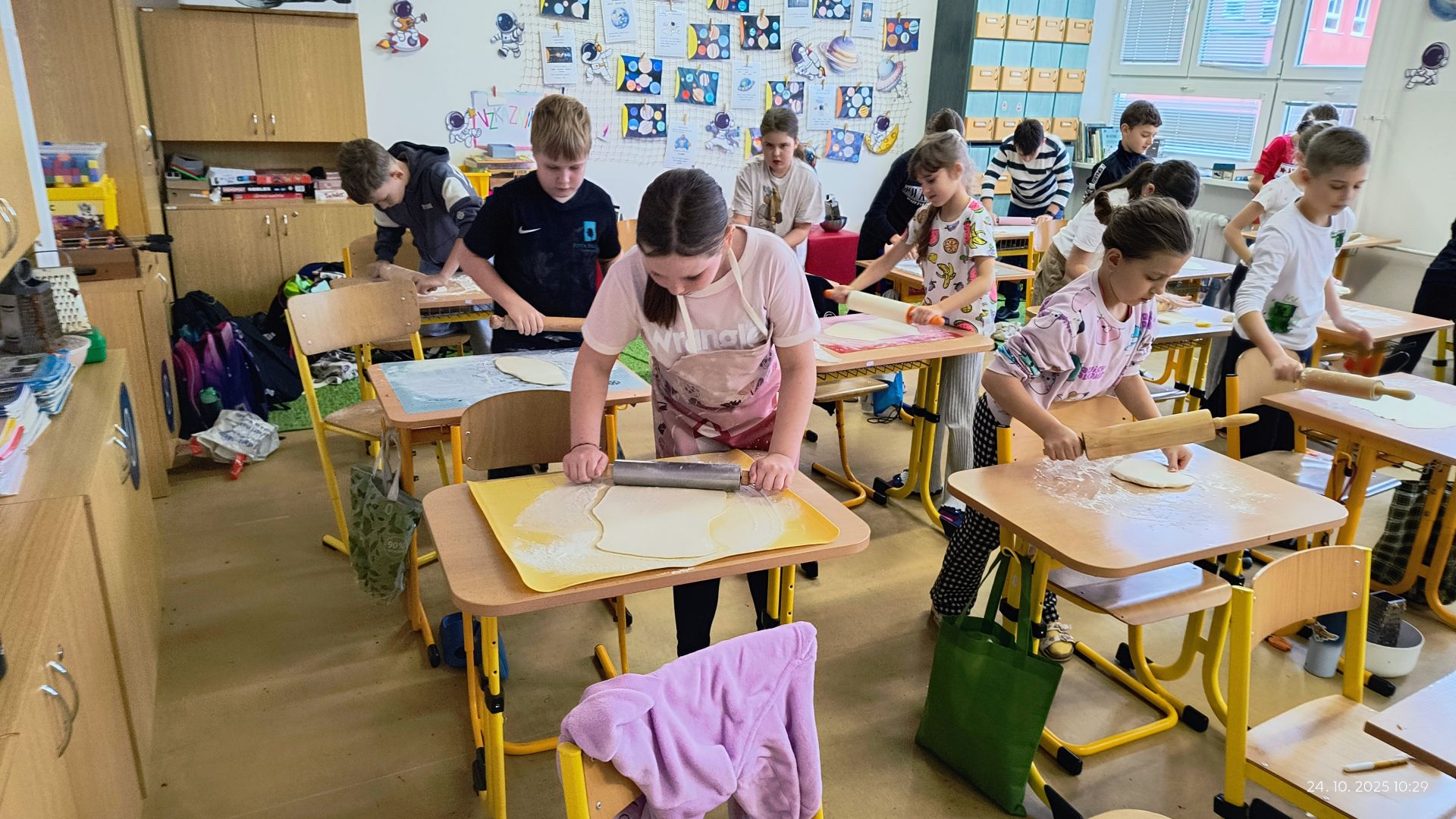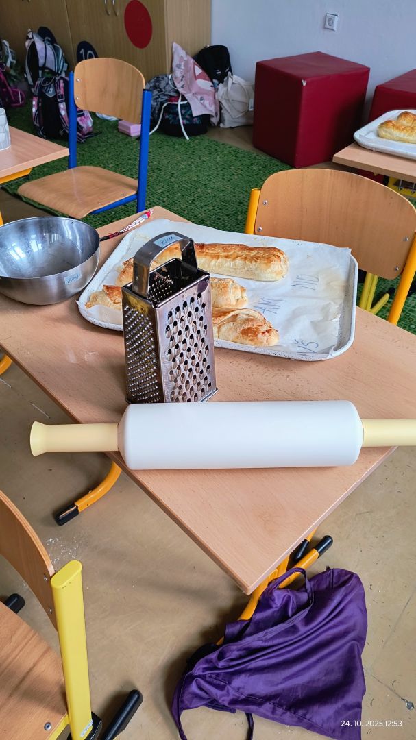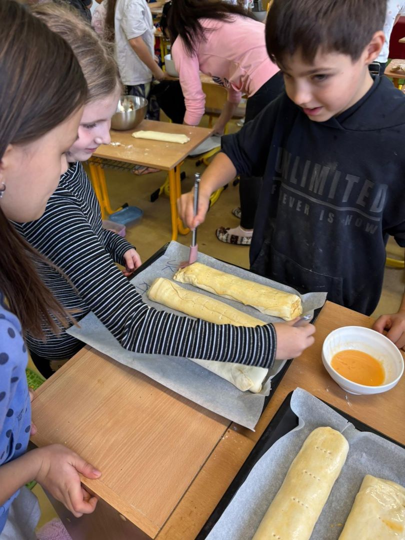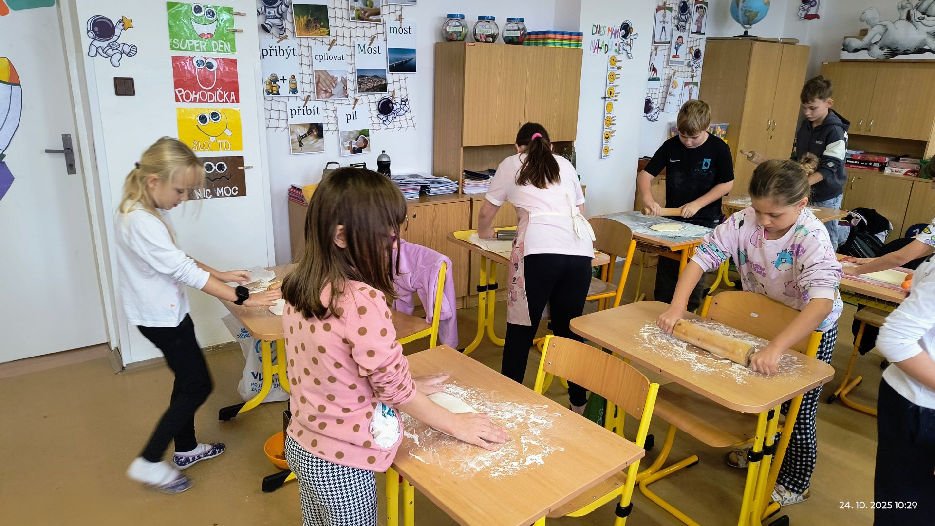 Šustící barevné listí všude kolem, teplé kabáty a svetry si ve skříních vyměnily místo s tričky a tílky. Podzim. Barevný, veselý, větrný, někdy deštivý. Doba, na kterou se všichni sadaři, zahrádkáři i zemědělci těší dost možná z celého roku nejvíc. Už žádné tahání konví vody, nekonečné vytrhávání plevele, konec lovu slimáků a podobných nevítaných hostů. Doba česání ovoce, ukládání zeleniny. Prostě, sklizeň. Po loňskému Farmářském dnu postoupila 4. A takříkajíc o level výš. Veškerou úrodu totiž umíme pojmenovat a rozdělit do beden i bedniček podle druhu. Letos je třeba tu dobrou nádheru také nějak zpracovat. Protože prý nečekaná nadúroda jablek, pustíme se rovnou do té šťavnaté křupavé lahůdky. Nejlepší jsou určitě přímo ze stromu - také jsme několik košíků voňavých červených plodů vyzkoušeli. Ale, co s nimi dál? Sušit, moštovat, uložit na zimu.Hm...co takhle něco dobrého z nich upéct? Schválně, co vás napadne jako první? Samozřejmě - závin, štrúdl. Tak, proč ne? Vyzbrojeni válečky, struhadly, skořicí, cukrem a bojovným duchem, pustili jsme se do práce. Pravda, při válení těsta byl stav tak nějak nerozhodný. U některých jasně vítezilo těsto, které odmítalo mít tvar obdélníka. Nevadí, nevadí, jsme bezva partička, vzájemně si pomůžeme. Zručné a zkušené pekařky vzaly válečky do svých rukou. Nastrouhat jablka, podsypat strouhankou, přidat cukr a voňavou skořici, zamotat..hotovo. Kdepak, kdepak, ještě potřít vajíčkem, propíchat a nedočkavě koukat do trouby na ten svůj kousek. Jakpak se mu v tom teple daří? Povedly se všechny náramně, v každé rodině měli v pátek o večeři postaráno. Máte hodně jablek? Tak těsto, váleček, mouku..ostatně, návod jsme napsali. Dobrou chuť a ať se dílo podaří!