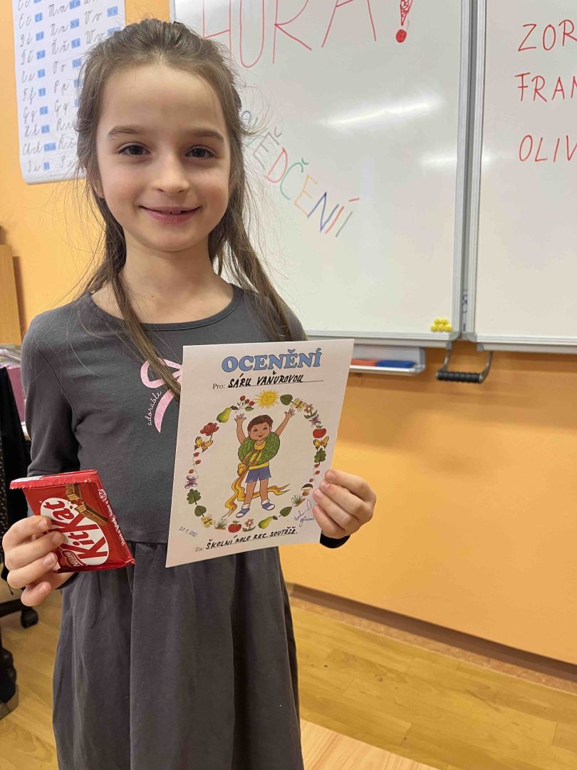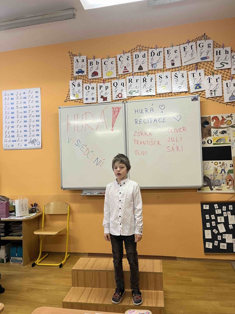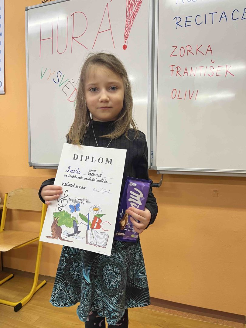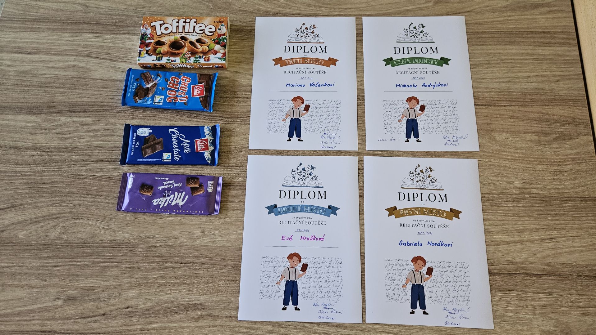 Všichni vítězové dostali sladkou odměnu a diplom na památku. Postupujícím přejeme, aby se jim podařilo pěkně přednést své básně i v okrskovém kole, které bude probíhat 26. 2. 2026 na ZŠ Videčská.