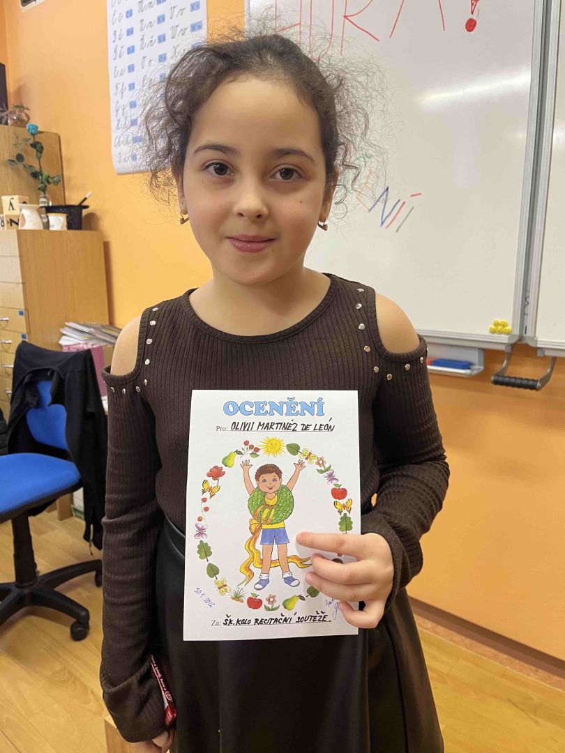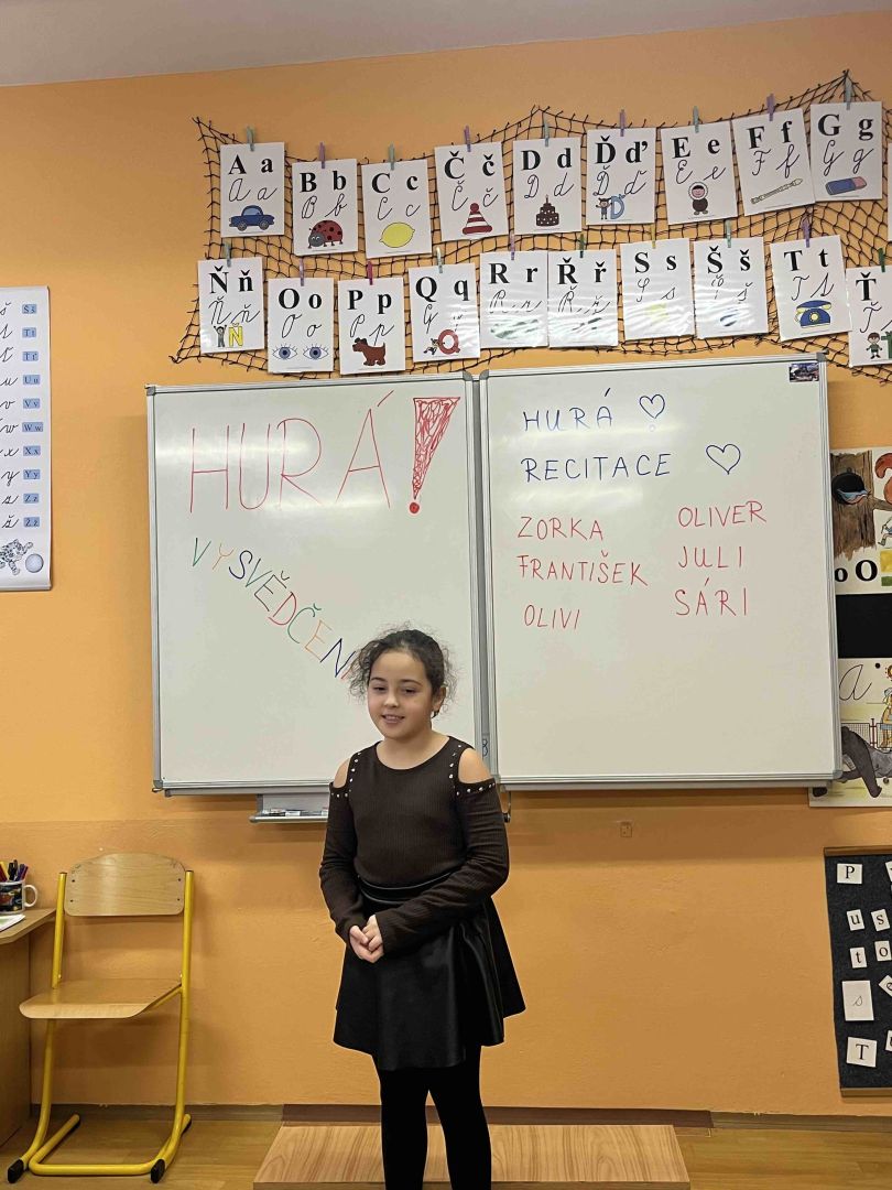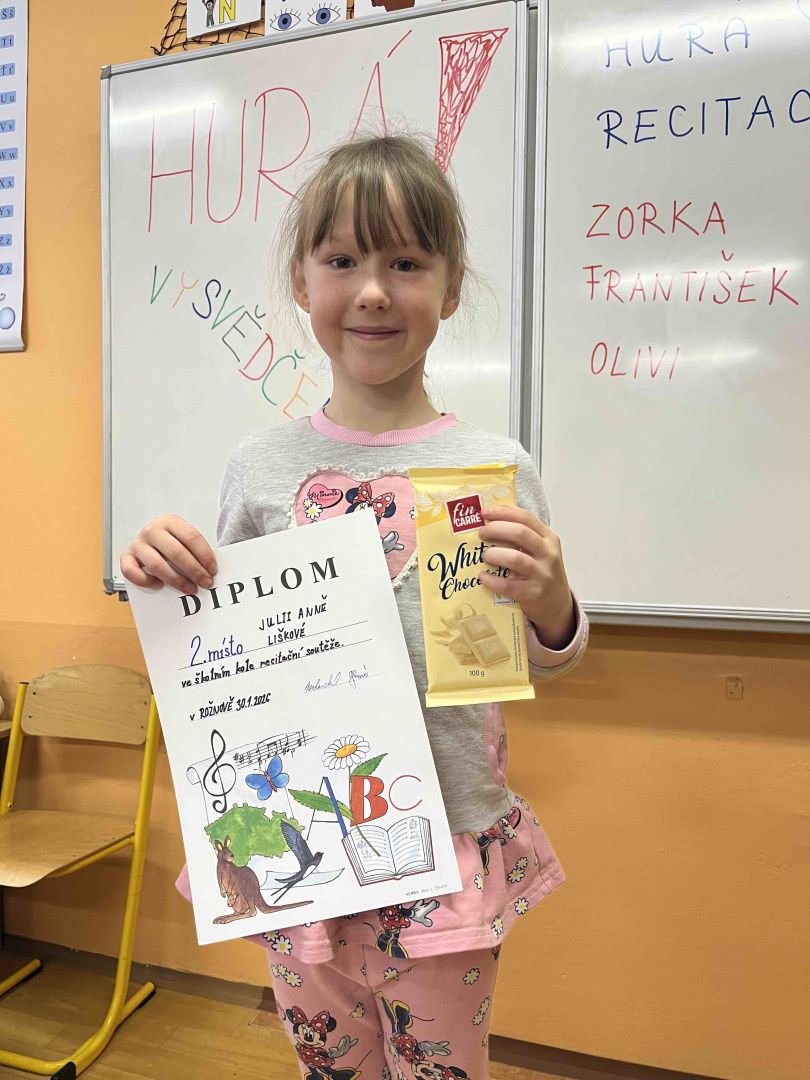 2. místo Anna Julie Lišková z 1.B s básní Rosnička od Jana Čarka.