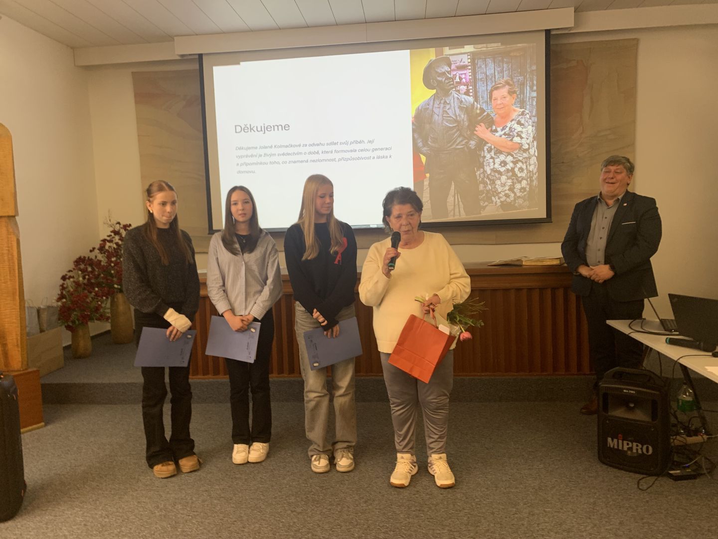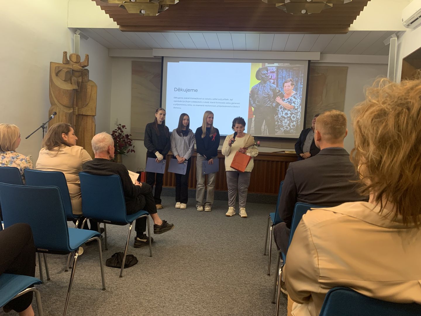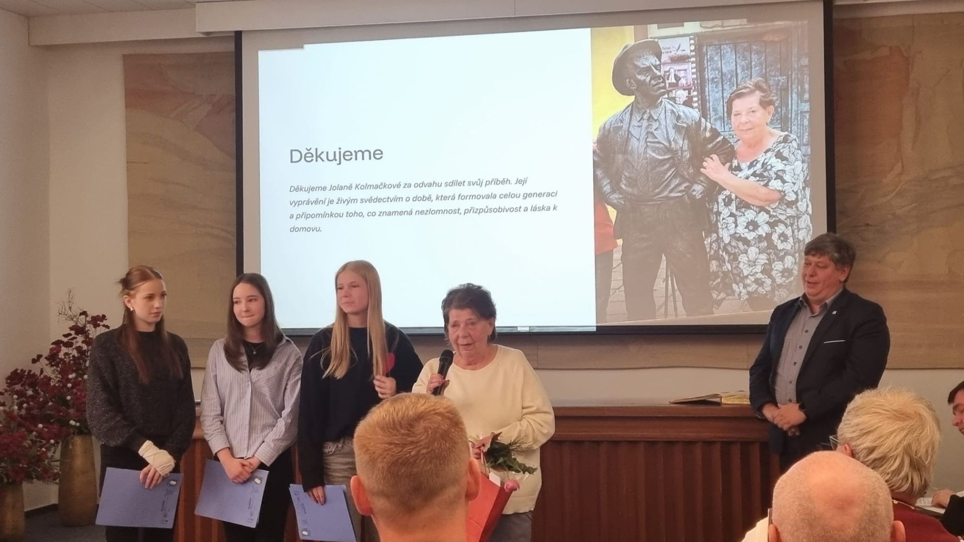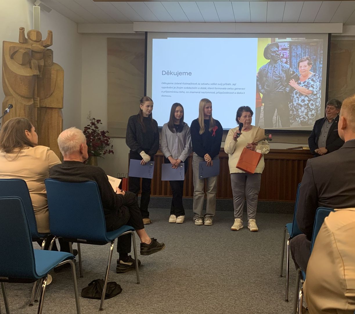 Ve středu 25. března se žákyně z 9. A Veronika Strakošová, Lucie Kolmačková a Kateřina Javorová zúčastnily slavnostní prezentace projektu Příběhy našich sousedů, která se konala od 16 hodin v obřadní síni rožnovské radnice.