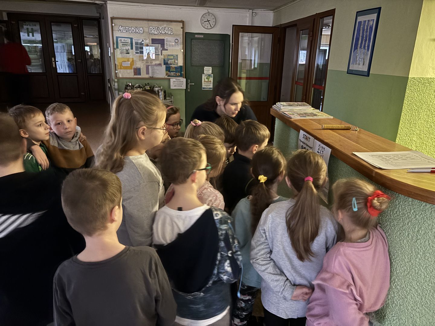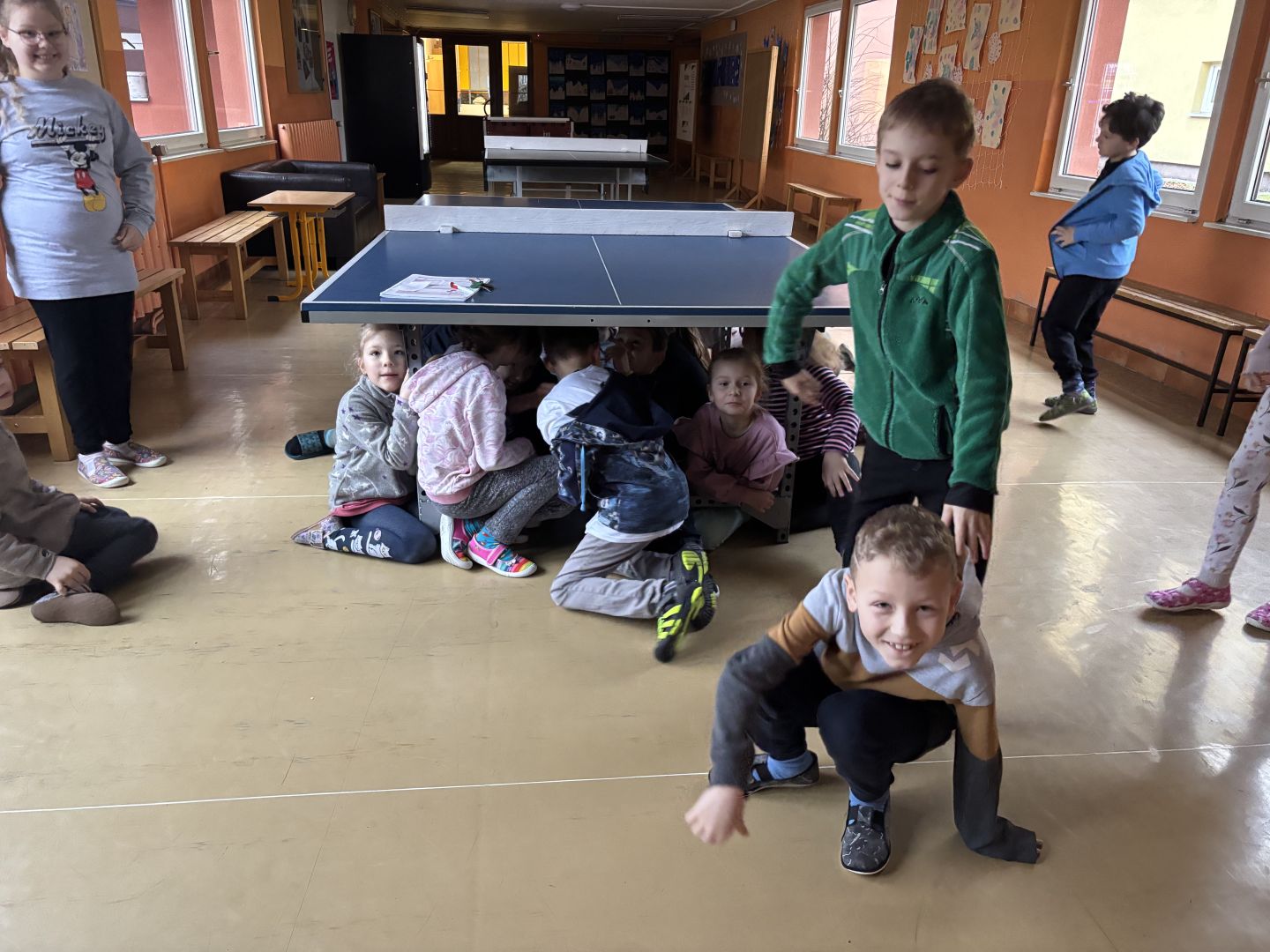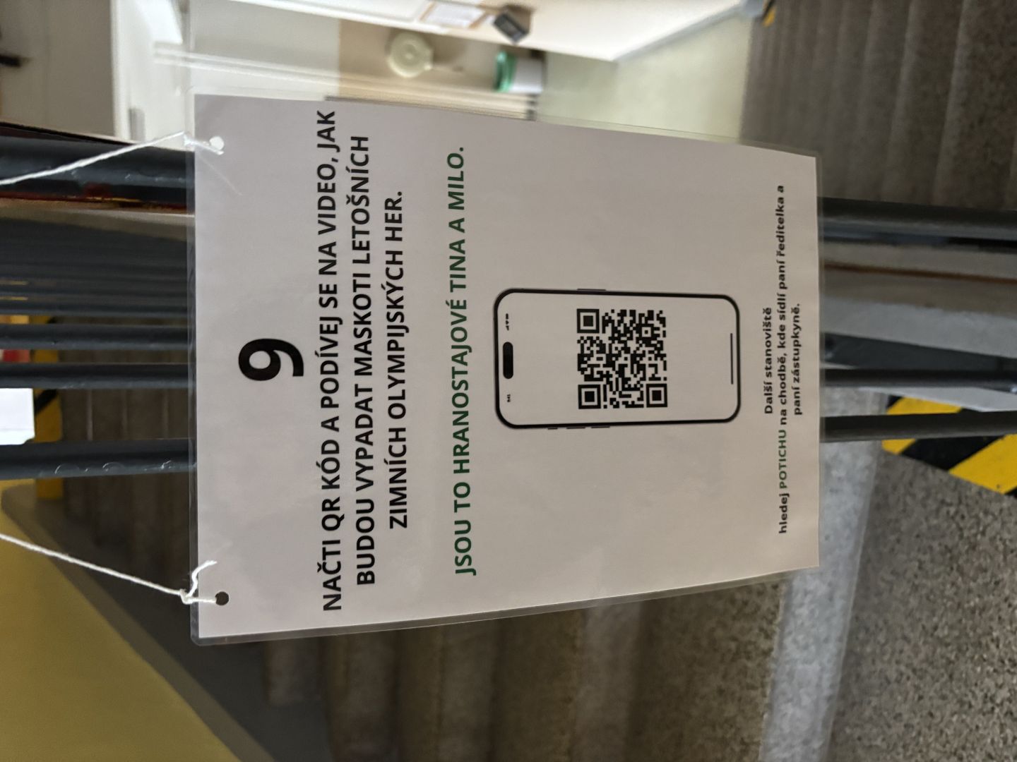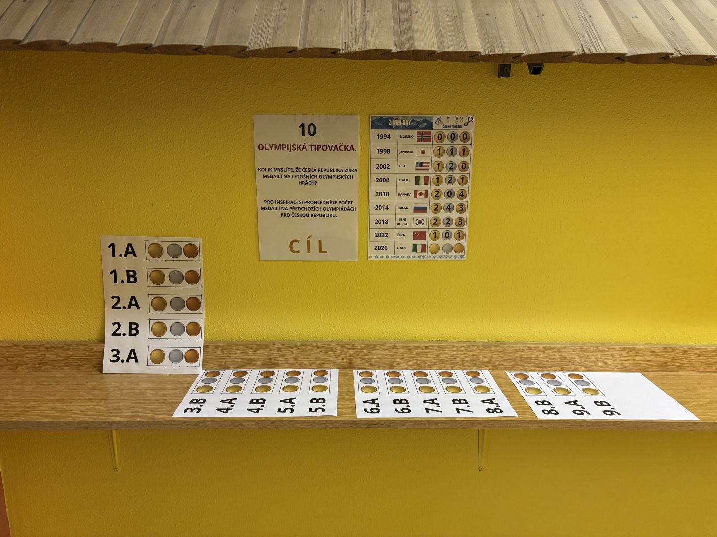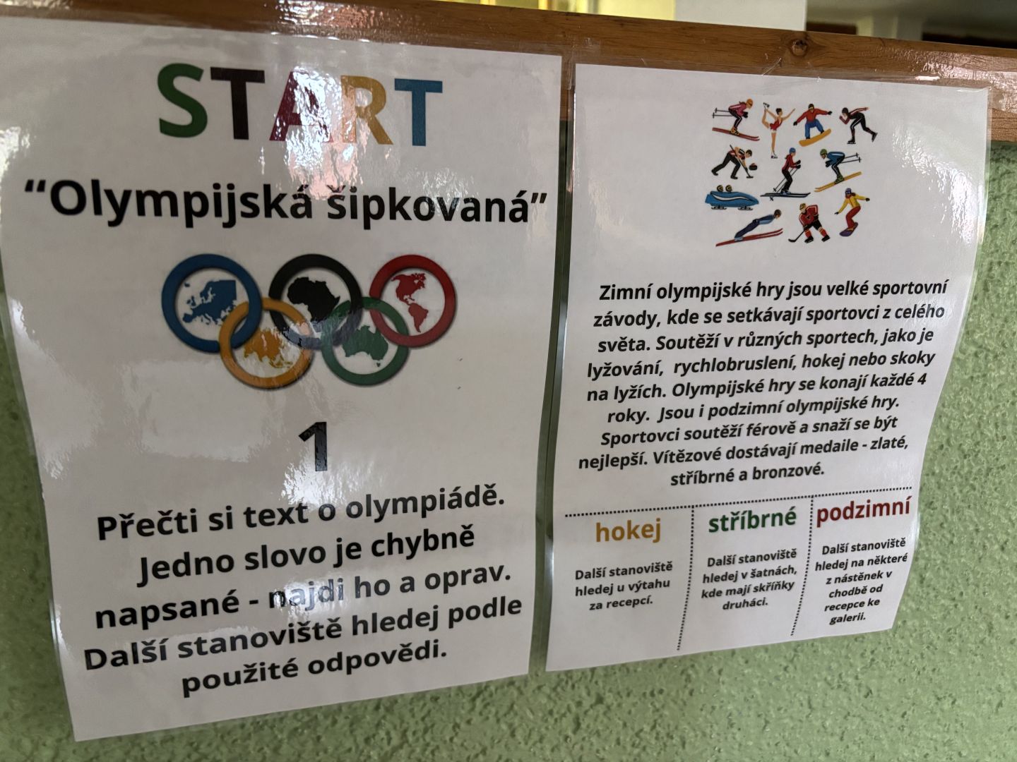 Na škole se ve středu objevila olympijská šipkovaná. Té se zúčastnily i třídy z druhého stupně a všechny bavila. Každý správně splněný úkol nás poslal na další stanoviště někde po škole. Některé úkoly jsme museli hledat v temných zákoutích školy nebo pod pingpongovým stolem. QR kódy ve hře nám ukázaly maskoty letošních her nebo nás odkázaly na olympijskou hymnu. Na posledním stanovišti nás čekala tipovací hra - každá třída dala svůj tip, kolik Česká republika získá během následujících 14 dní medailí. Jsme zvědaví, která třída bude mít nejlepší odhad.