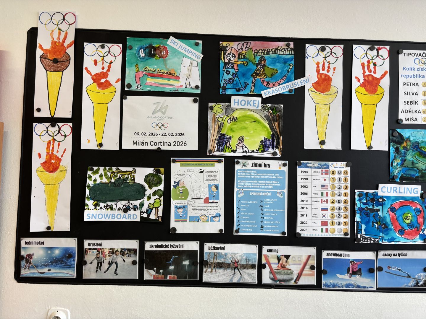 Žáci se seznámili s historií a vznikem olympijských her v projektových hodinách. Olympiáda se promítla i do hodin tělesné výchovy. Prvňáci hráli v tělocvičně improvizovaný curling, jiné třídy cvičily s "olympijskou" pochodní a dokonce jsme si vytvořili i živé olympijské kruhy. Seznamovali jsme se disciplínami zimní olympiády, omrknuli jsme české reprezentanty a vyvěsili jsme si podrobný program českých sportovců na olympiádě. Výsledky budeme pečlivě sledovat a budeme všichni držet palce. Samozřejmě už také tvoříme tematické obrázky v hodinách výtvarné výchovy.
